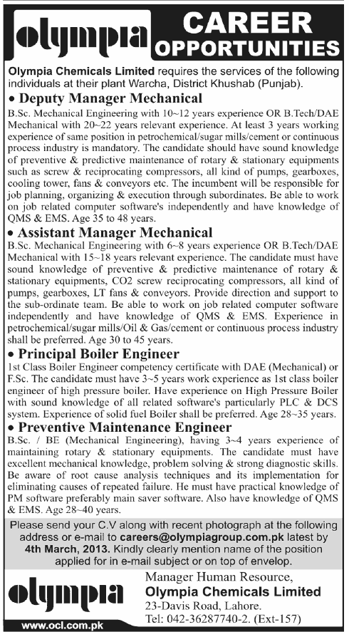 Jobs in Olympia Chemicals Limited Lahore 2013